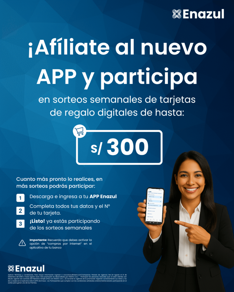 Afíliate a nuestro nuevo Aplicativo Móvil Enazul y participa en los sorteos semanales de tarjetas de regalo digitales de S/100 y S/300 soles.